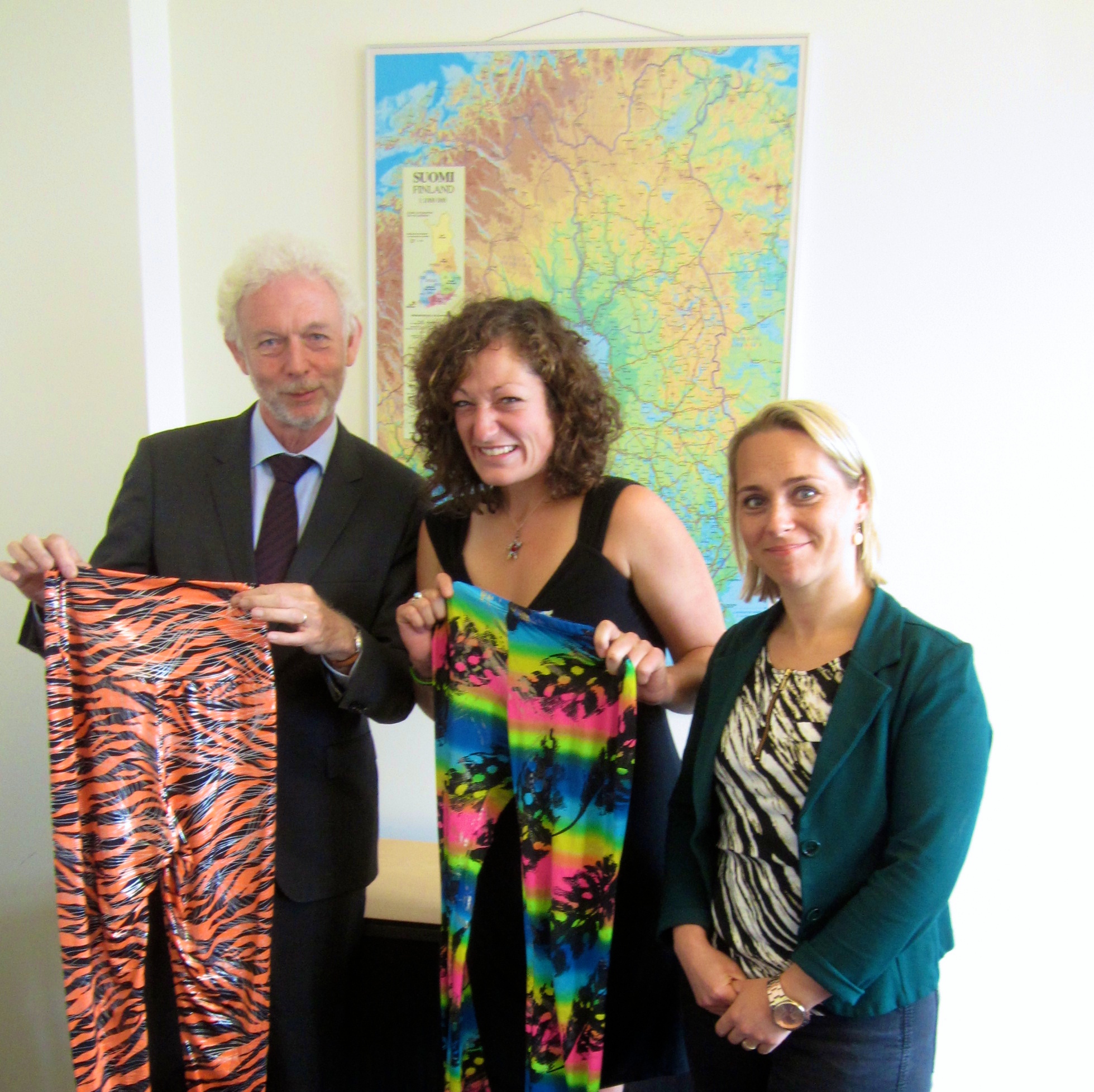 Today, in an event I have been looking forward to for a while, I had coffee at headquarters of the Dutch Ambassador to Finland.  I was both honored that the embassy has taken such an interest in my story and slightly disappointed, as the Ambassador got pulled away on “urgent business” and wasn’t able to join.  Still, we were graciously received by Counsellor Hans Kruishoop and Ilona, the Public Diplomacy Officer.  I presented them with some San Francisco Blue Bottle coffee, sugared almonds, and of course – Adventure Pants for the Ambassador.