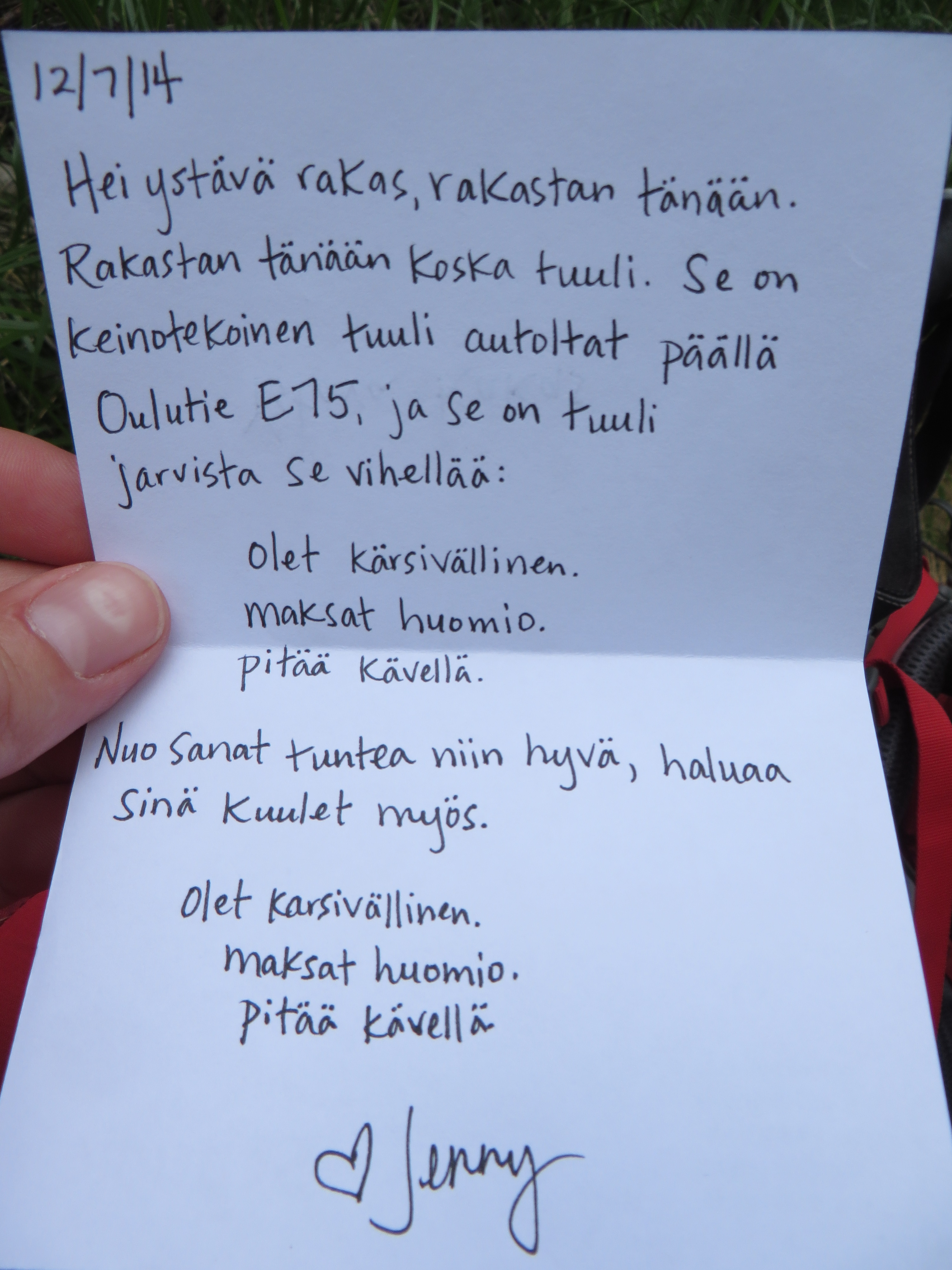 My final letter is not yet written, but there is a Dear Friend somewhere in Oulu who will receive it before I leave for Rovaniemi tomorrow.  As Part 1 of my journey comes to a close, it feels important to give some more thought to why I truly love today.  I will post it soon, with my plans for Part 2: The Arctic Circle!