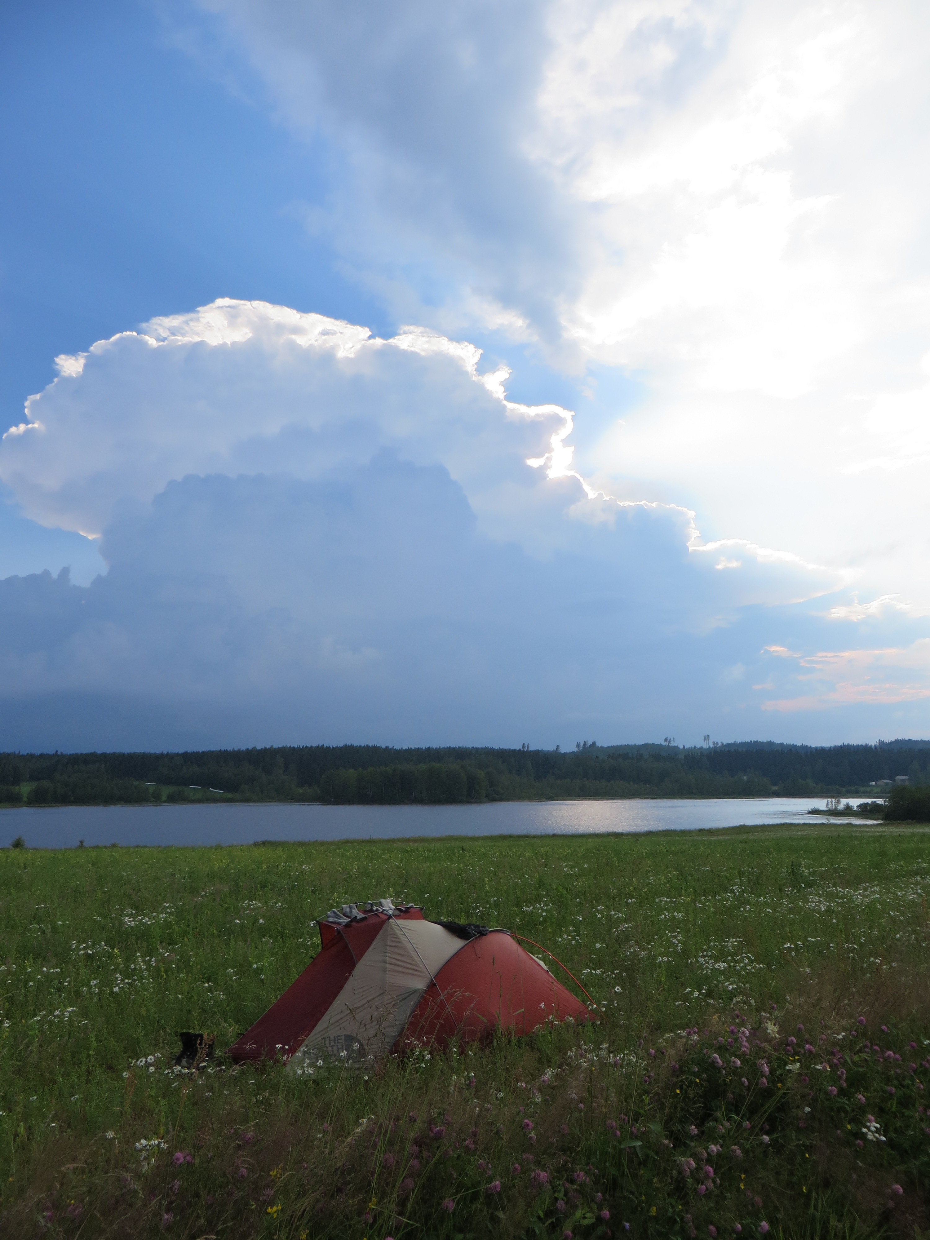Thunderclouds over my camp in a field of wildflowers.
