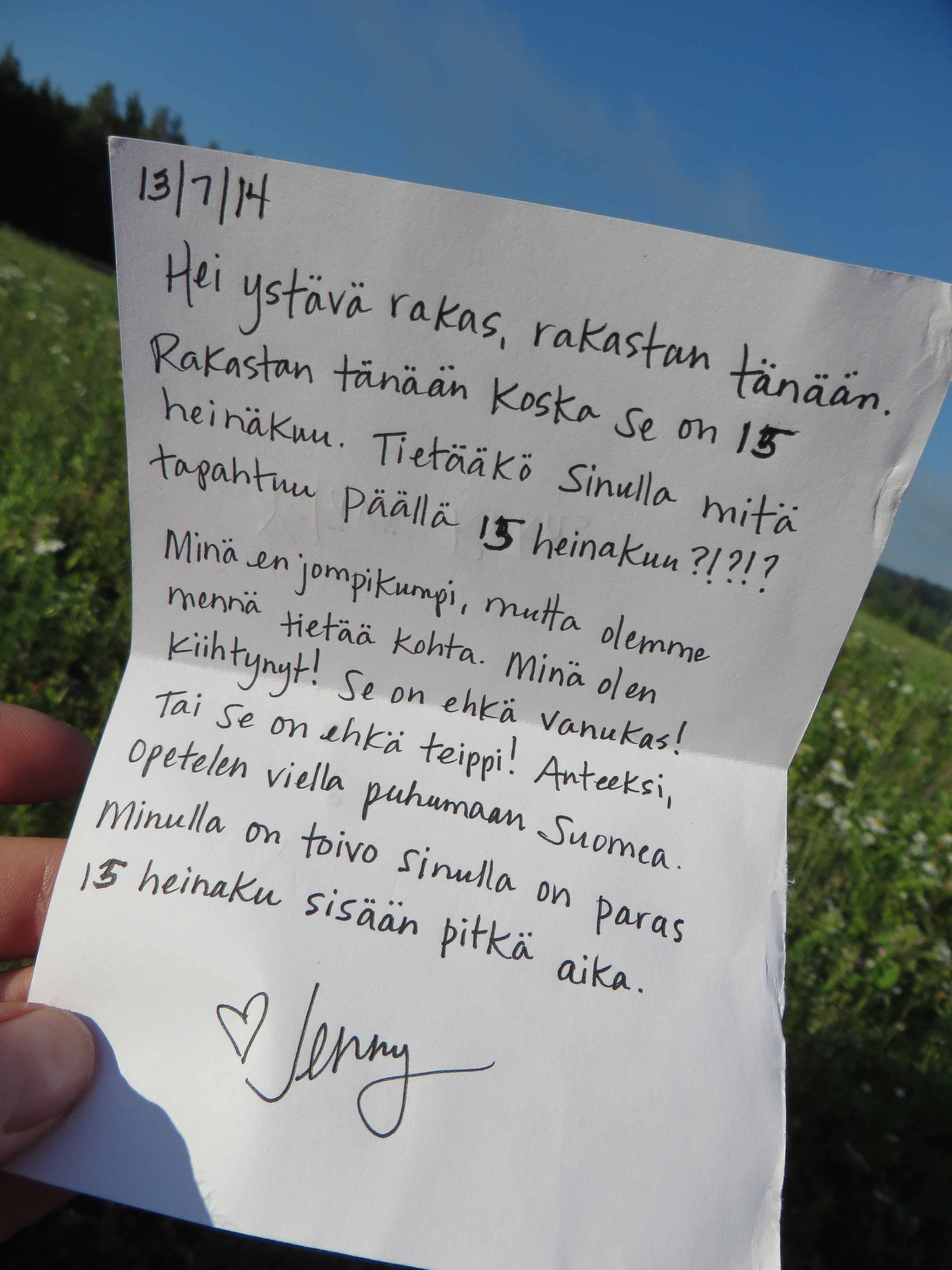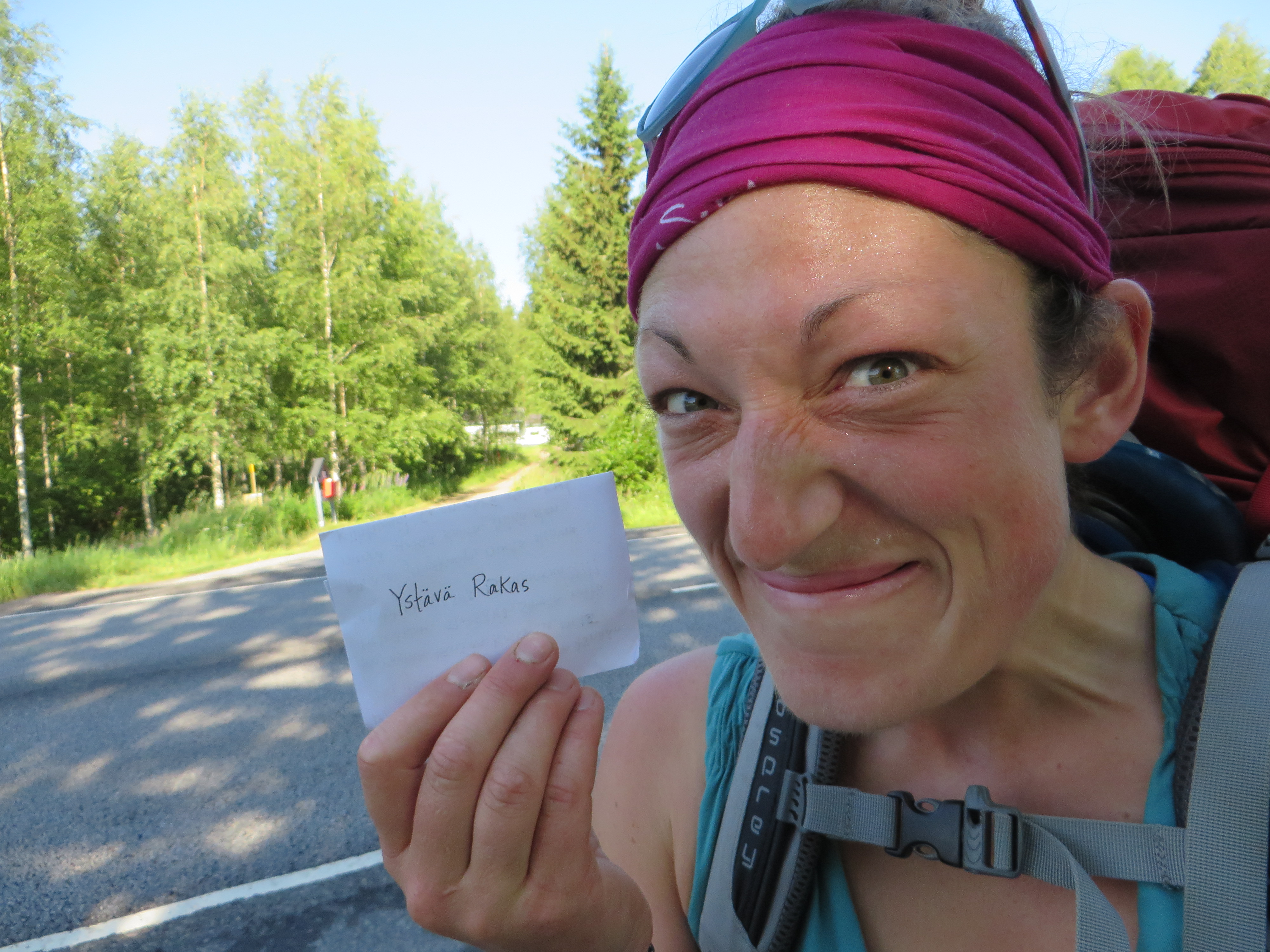 On Monday, I began walking north from Jyväskylä toward Oulu.  I have been trying to learn the Finnish language, without much success.  Each day of my walking journey, using the Finnish dictionary I had on hand, I wrote a letter to a stranger and left it in a mailbox along the road.  Given that a lot of Finnish words have multiple meanings and my grasp of the language is terrible at best, my letters probably didn’t mean what I thought they meant.  But maybe, hopefully, someone smiled because of it.