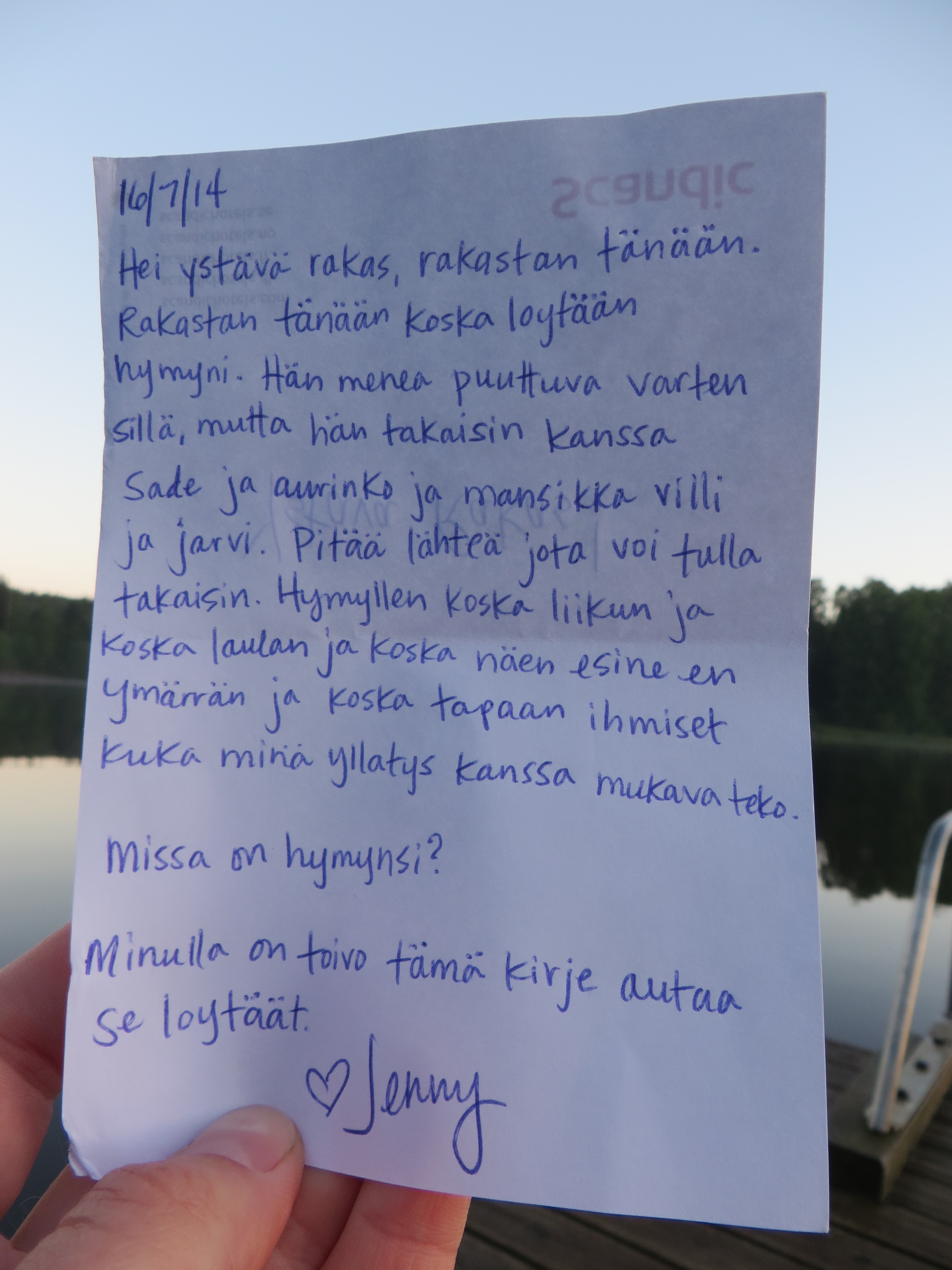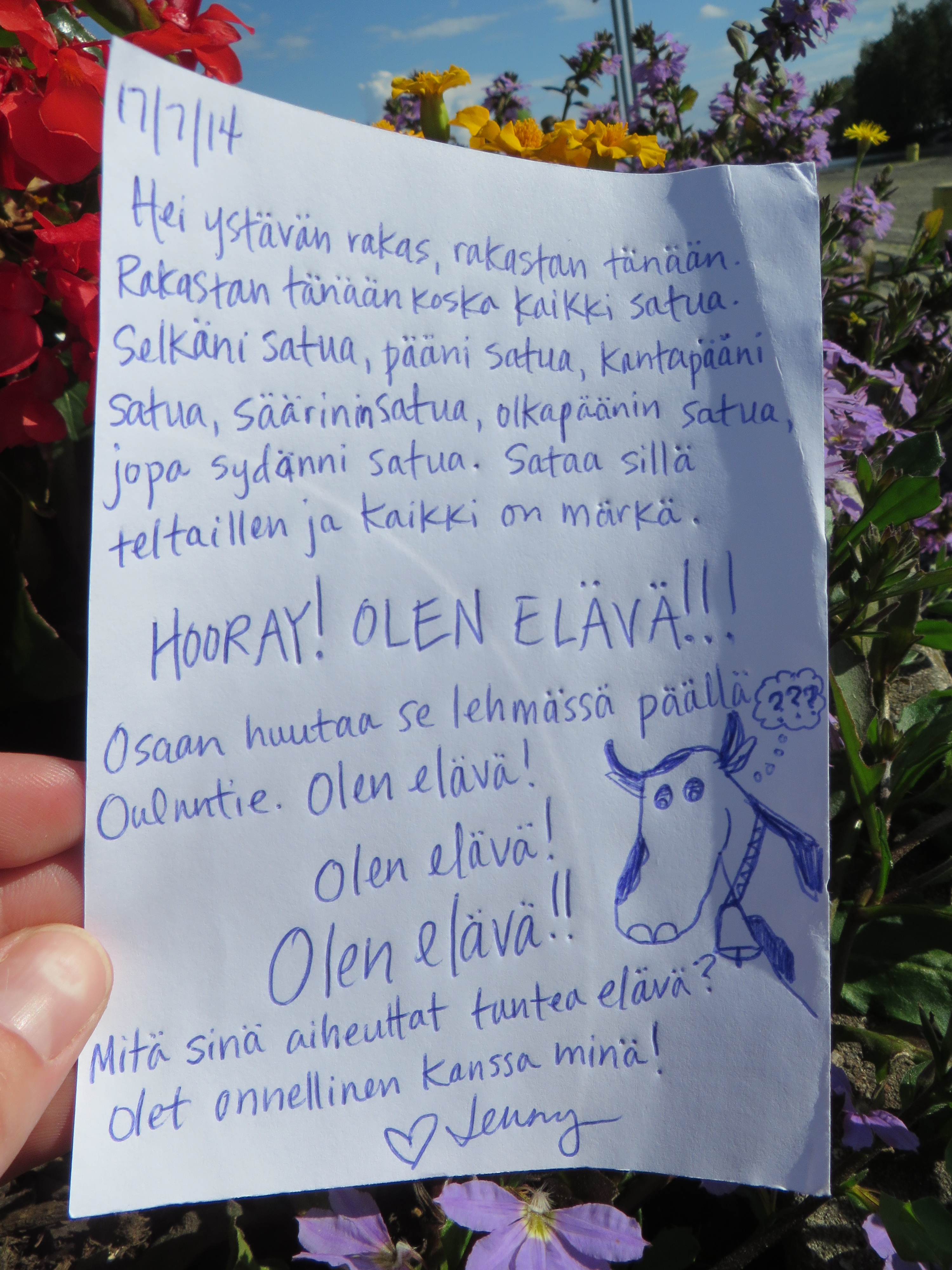 3. Hey Jenny, this is Dave Getz, the drummer with Perfect Blue Sky, You were hanging out with us in Aulanko/Hameenlinen and then again at that strange festival where it rained and there was a guy with a viking helmet with horns, I’m finally getting to visit your Petronella site, wondering if you are still there in Finland, how things have turned out, your writing is inspirational..’I love today’ is such a great thing to say and feel..Wish that Robin Williams could have known it.