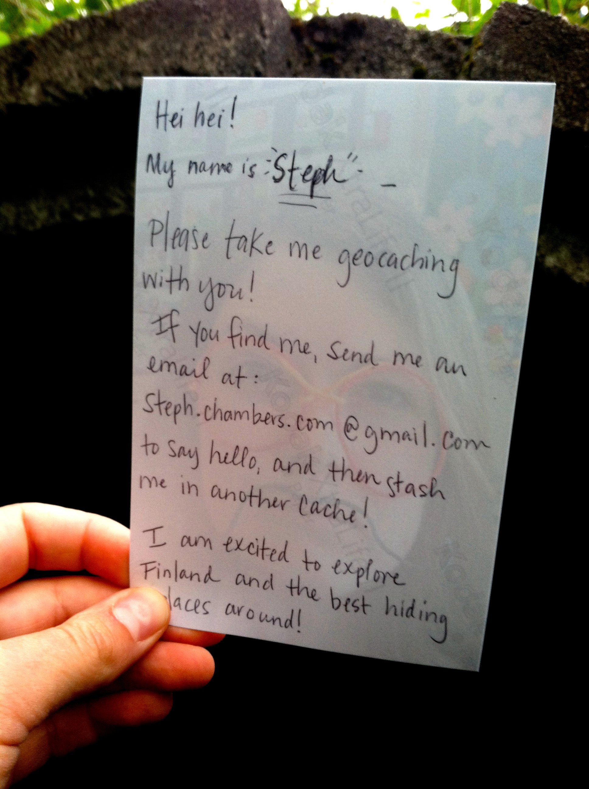 Last week, Tuukka and I found a geocache in his neighborhood drainage pipe. I braved the stinging nettle on the bank, took my shoes off and crawled in about 20 meters, dodging giant spiders and trying not to think about what I couldn’t see. Steph loves geocaching more than anyone I know – it was immediately clear where she belonged.