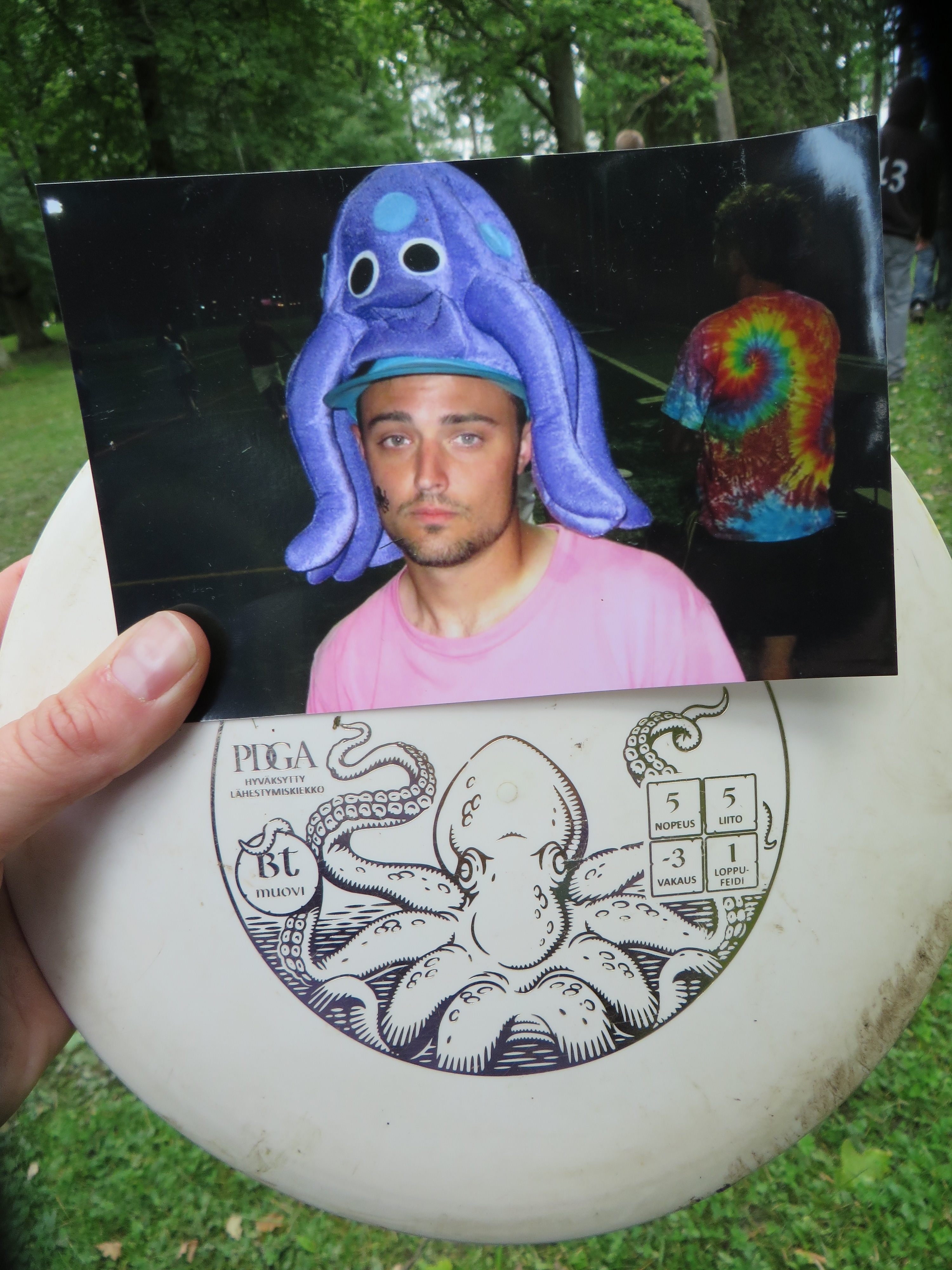 Sean Frick is my co-captain and co-creator of Rocktopus, the most spirited, fun ultimate frisbee team I have ever played on in my life, and probably ever will. One of my best friends in San Francisco during his time there, Sean took it upon himself to teach me the finer art of disc golf, which I sometimes sucked at but always loved since it seemed to be accompanied by good friends and good beer. Determined to follow Petronella’s footsteps by golfing in Aulanko, I chose to play disc golf, which is a little more my style. I made some great friends and sent the winner home with Sean’s picture. Joona even gave me his octopus disc golf disc, in honor of Rocktopus!